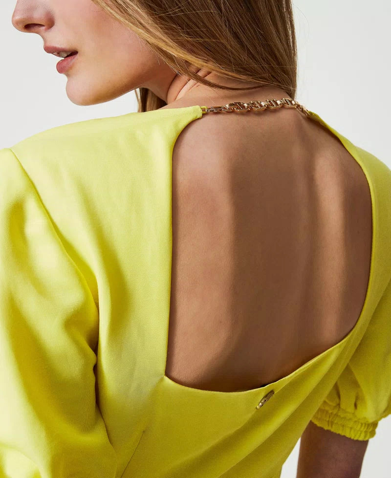 Short linen blend dress with balloon sleeves