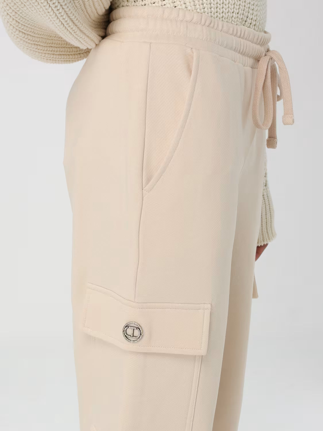 Mottled cotton plush fabric cargo trousers with metal Oval T logo. Covered elastic and drawstring at the waist, slant pockets and side pockets with flaps, covered elastic at the hem, joggers fit.