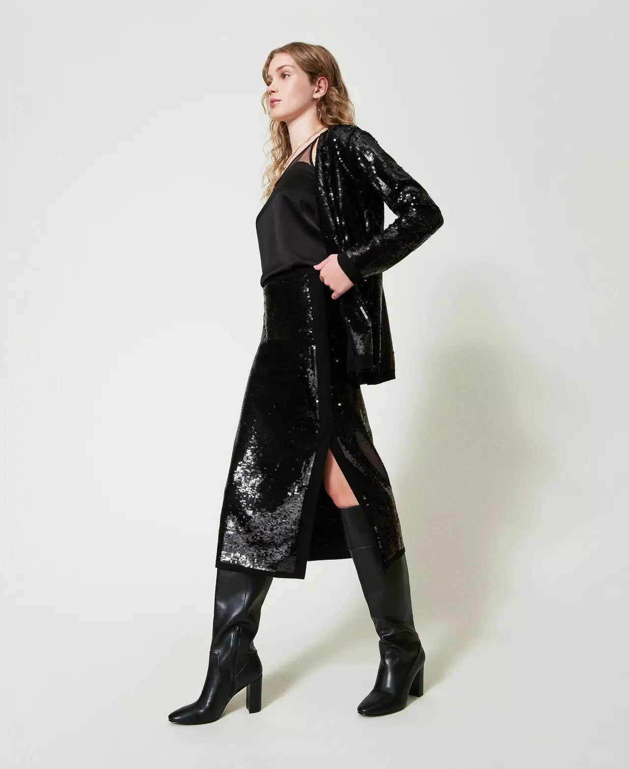 Wool lend midi skirt with full sequin embroidery, elasticated waistline, side slit at the hem, straight fit.