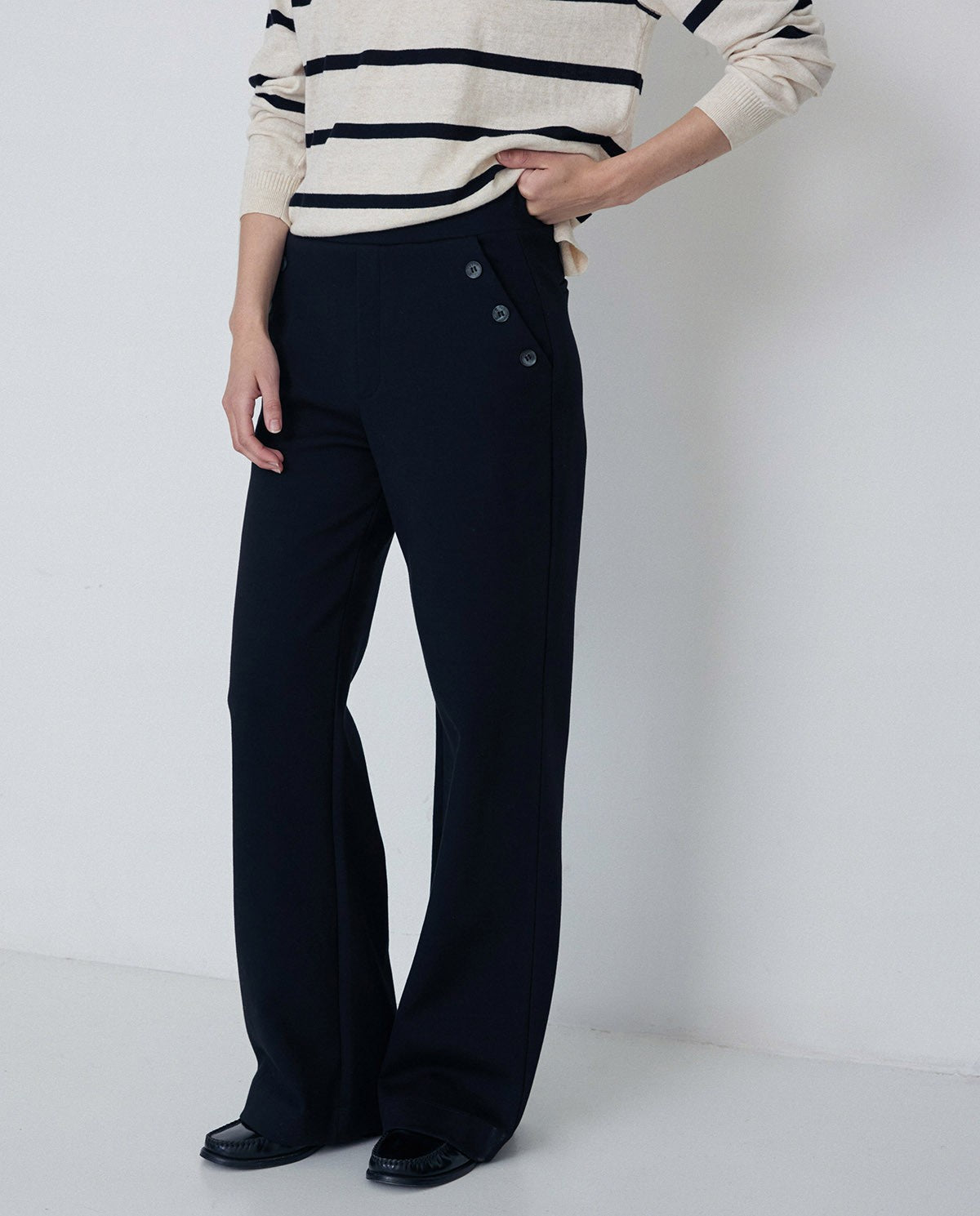 Knit trousers. Wide cut. Buttons on the pockets. Elastic waist. Side and back pockets. Composition: 78% cotton, 15% polyester, 7% elastane.