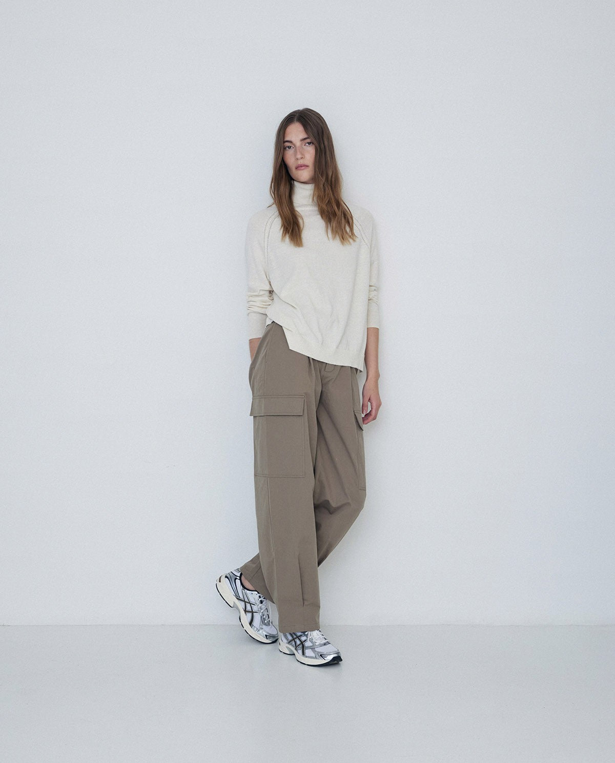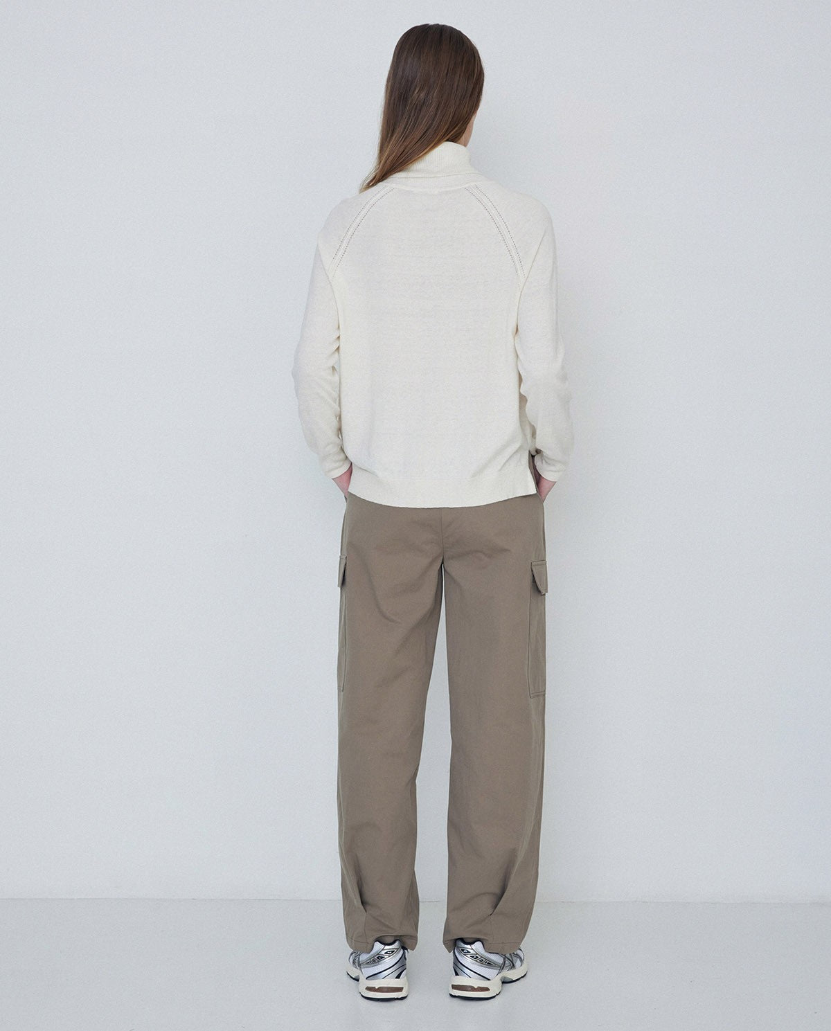 Wool knit sweater. Turtleneck. Long raglan sleeves. Ribbed accents.