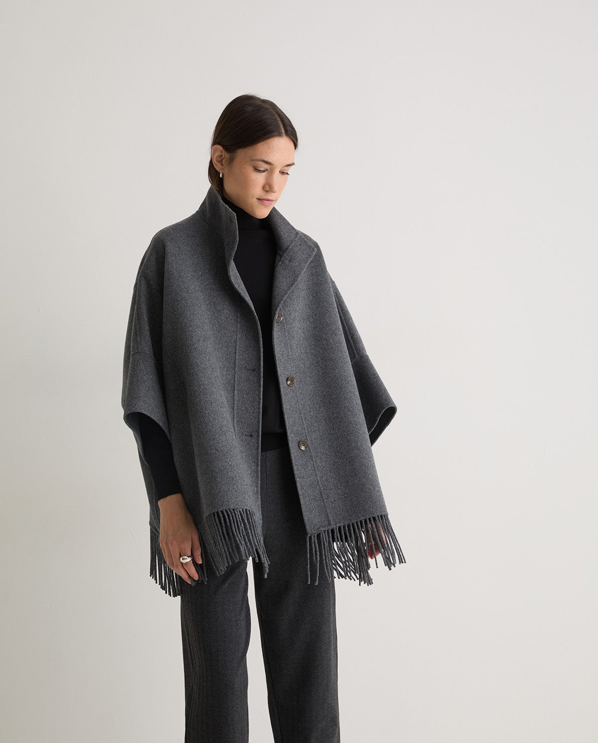 Handmade double-faced cape. Blend of wool and recycled fibres. High neck. 3/4 sleeves. Button front. Fringed ends. side pockets.