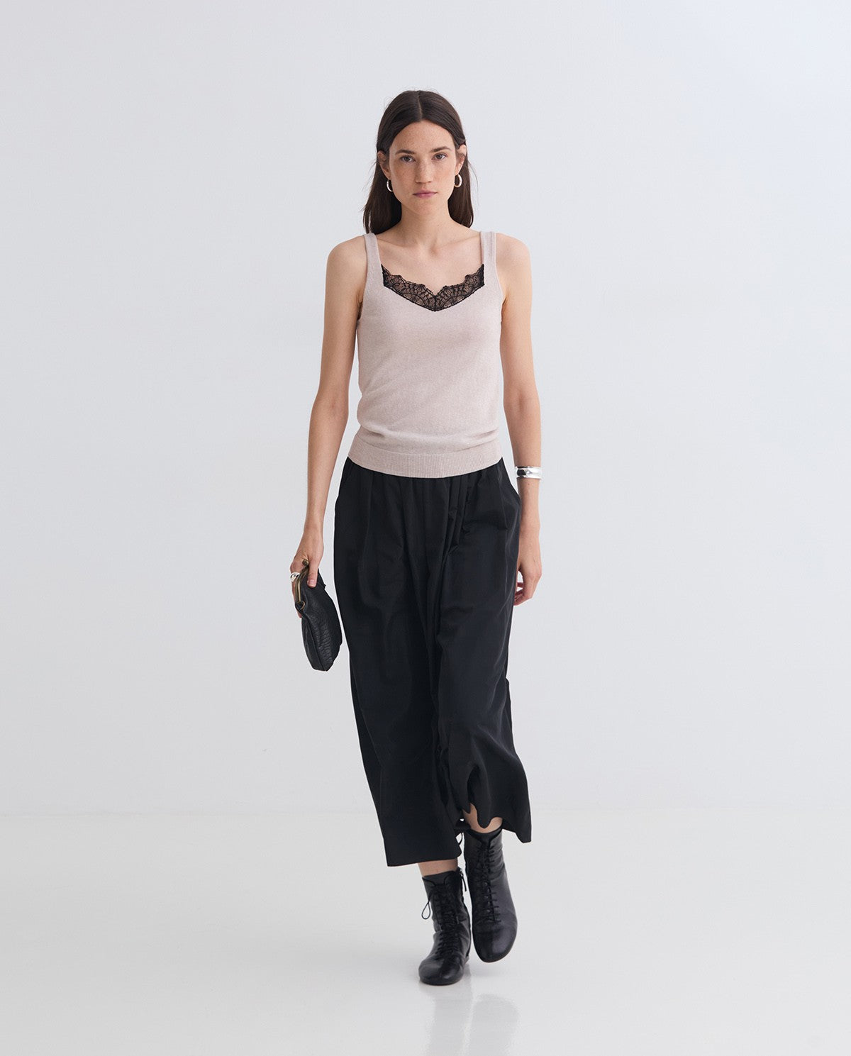 Wool and cotton blend lingerie top. Regular fit. V-neck. Sleeveless. Lace accent. Ribbed hem.