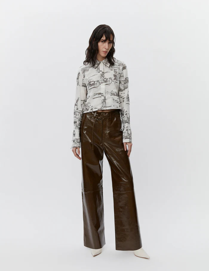 These low-rise, wide-leg leather trousers feature a zip fly and button closure, five pockets, and a removable belt. The trousers have a loose fit.