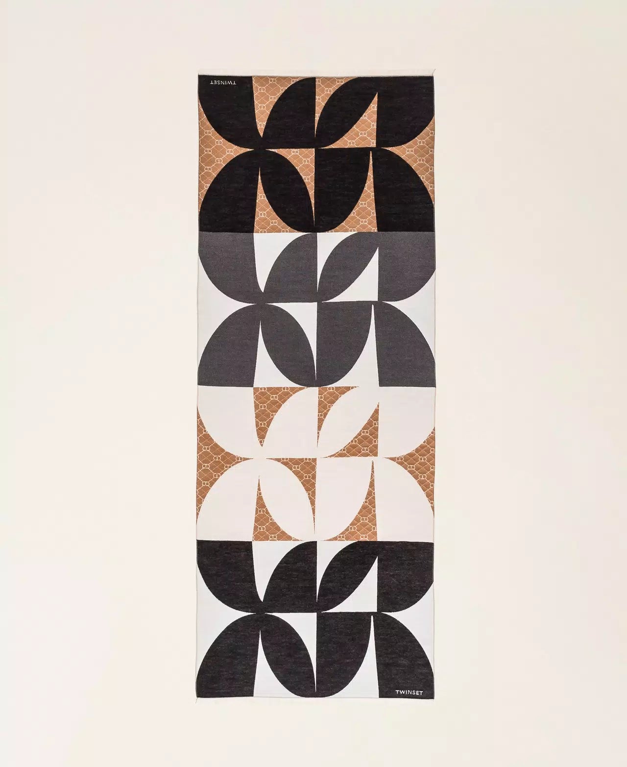 Wool cloth jacquard stole with geometric patterns and Oval T all over, fringed hem.