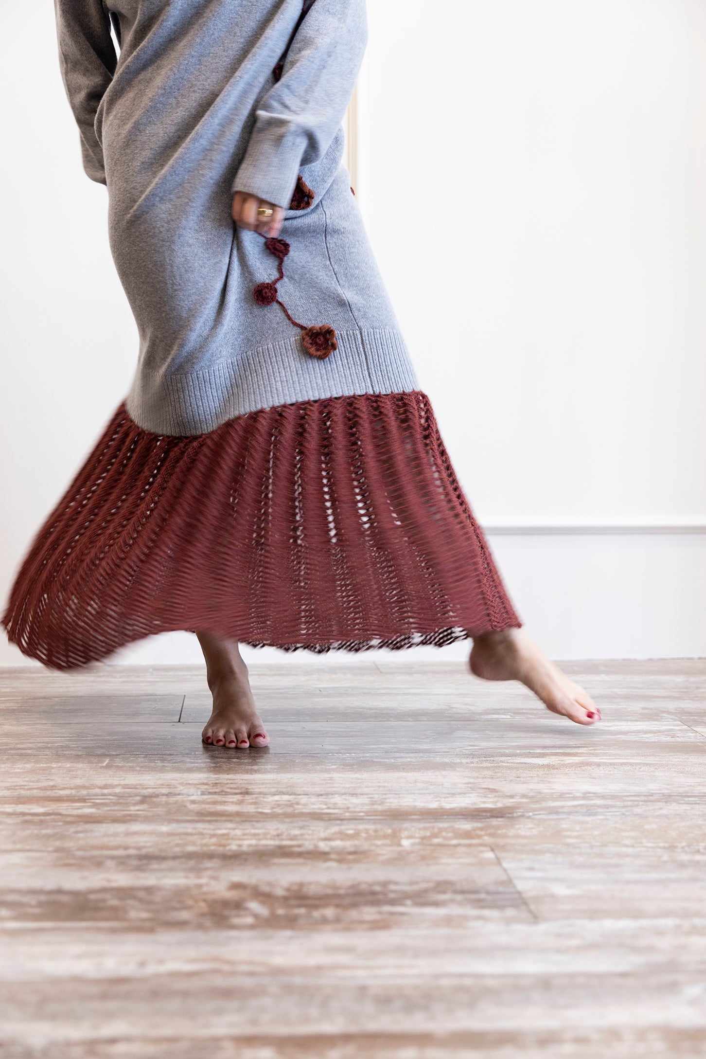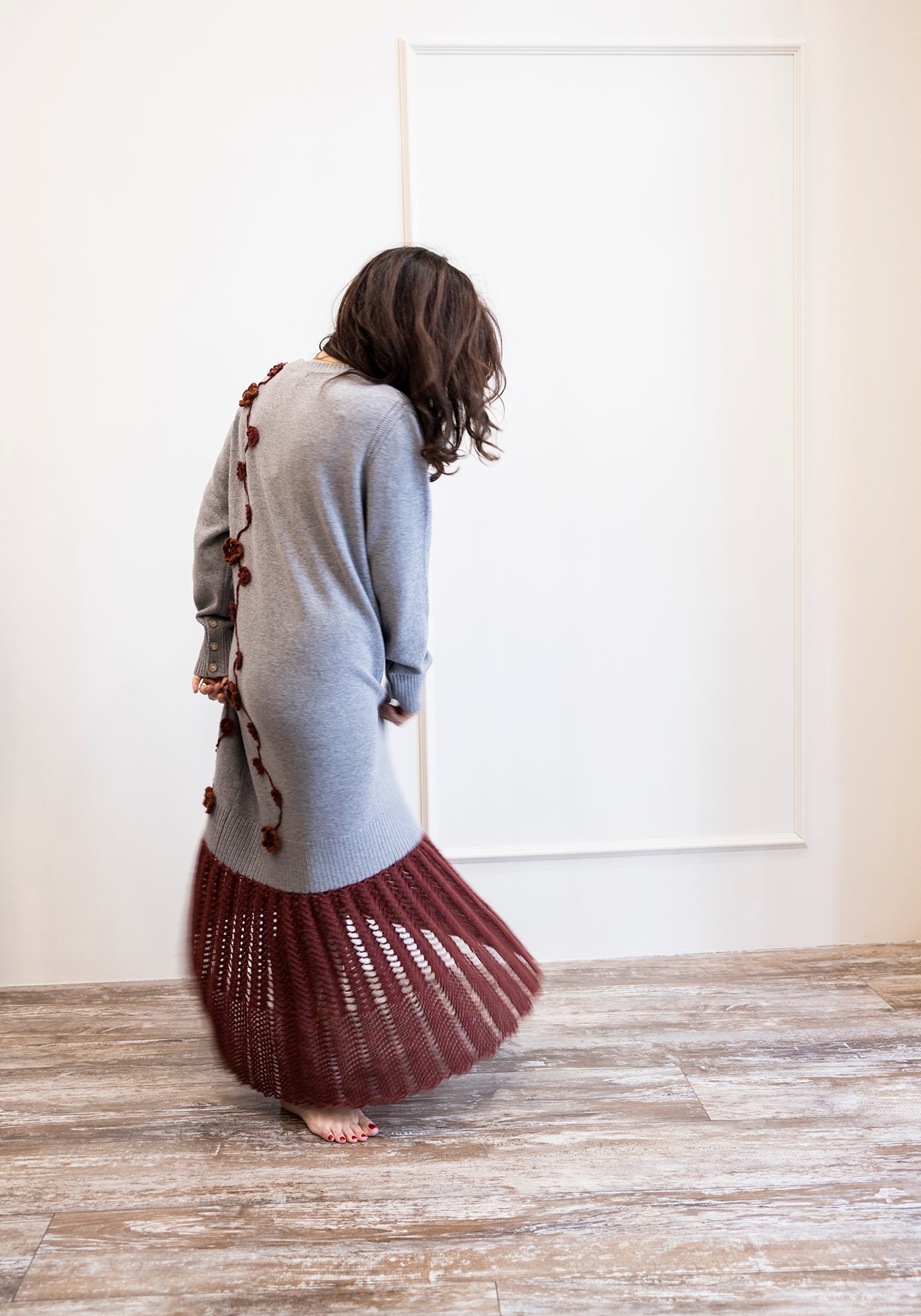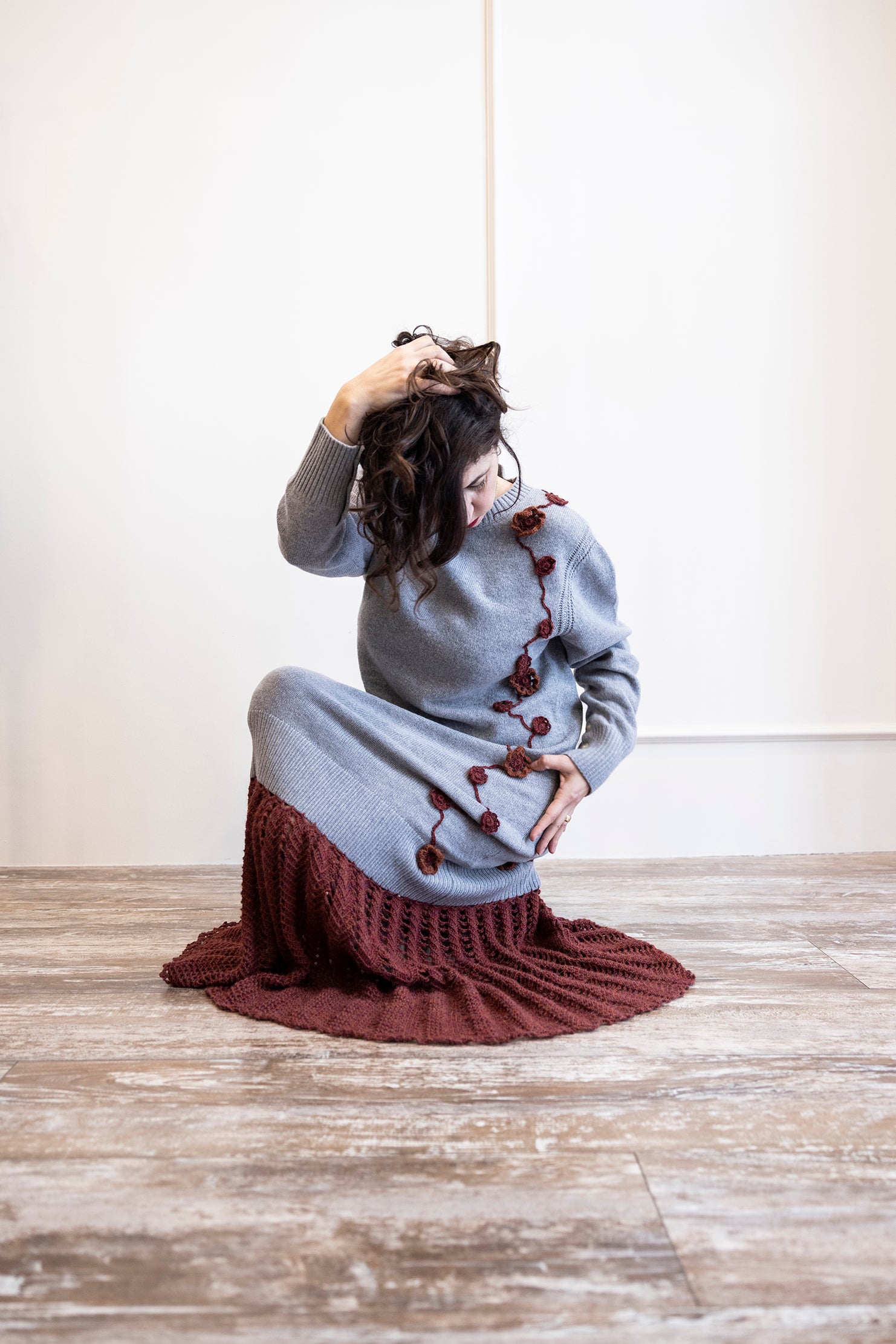 This dress began as a minimalist knit composed of 80% merino wool and 20% recycled nylon, selected for its softness, warmth, and fluid structure. It was transformed through over 30 hours of hand-crocheted alpaca lace, created and applied directly onto the garment, redefining both the upper bodice and the hem.